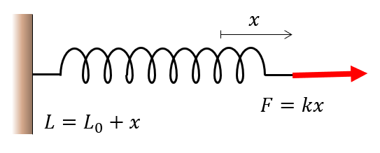Springs have a unloaded length, \(L_0\), and upon loading, a displacement \(x\). The force is typically modeled as a linear relation