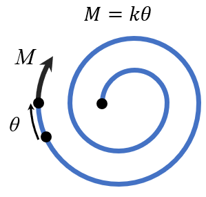 Torsional springs are loaded by an external moment, \(M\) and the displacement, \(\theta\) can be measured in radians (typically) or degrees. The relationship between the torque and angular displacement is given by the linear model