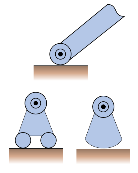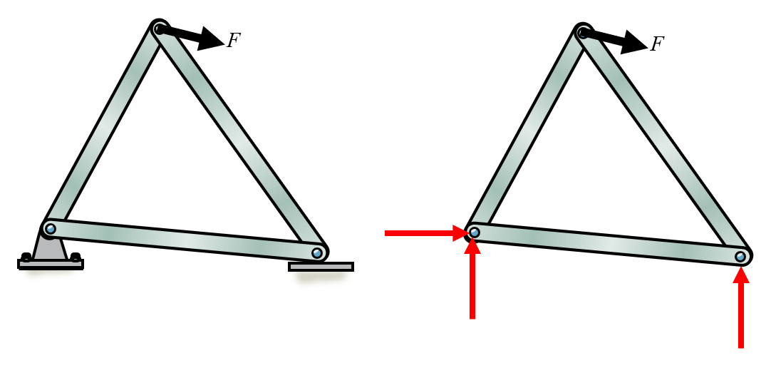 Here the supports of the structure are replaced with reaction forces. On the left we have a pin support, that can carry forces in both \(x\) - and \(y\)-directions, while on the right side the structure is supported in the normal direction only. The normal force is perpendicular to the ground surface. It is important to model all supports with forces, the directions do not matter. For instance the left support is modelled with a force in the positive \(x\)-direction, while the external force clearly points to the right as well, meaning that once the equilibrium equations are solved, the reaction force will be negative, indicating the proper direction of this force in equilibrium.