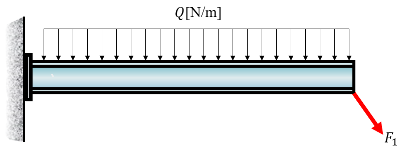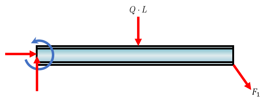 There is a uniform load applied on the top. All distributed loads can be transformed into point loads acting on certain locations. The locations are calculated by finding the center of area and the loads are integrated. Our case is the simplest case of a distributed load, it can be transformed into a point load acting in the middle of the beam and the total load is \(F_{\text {tot }}=Q \cdot L\).