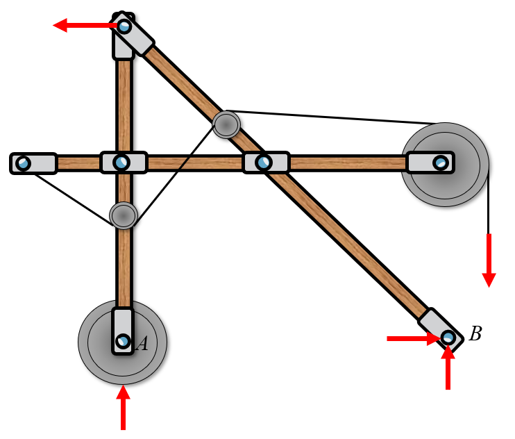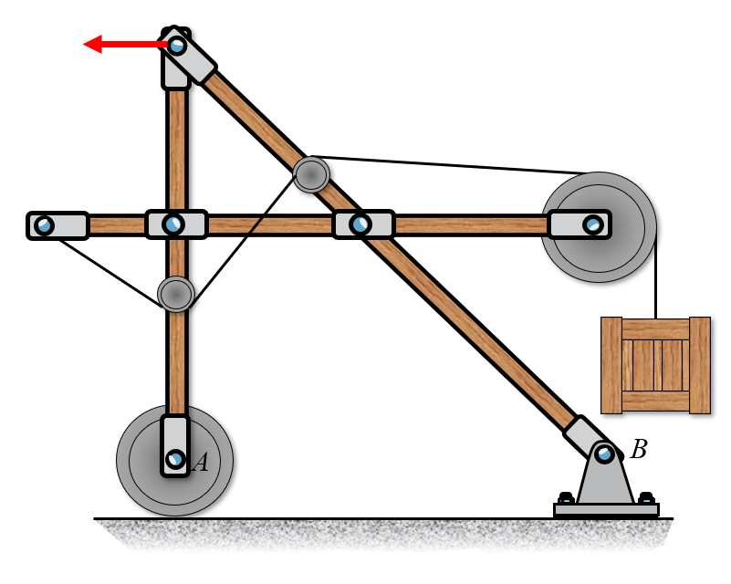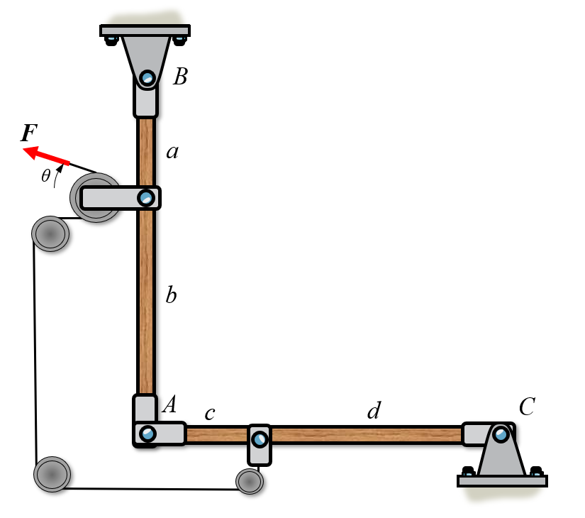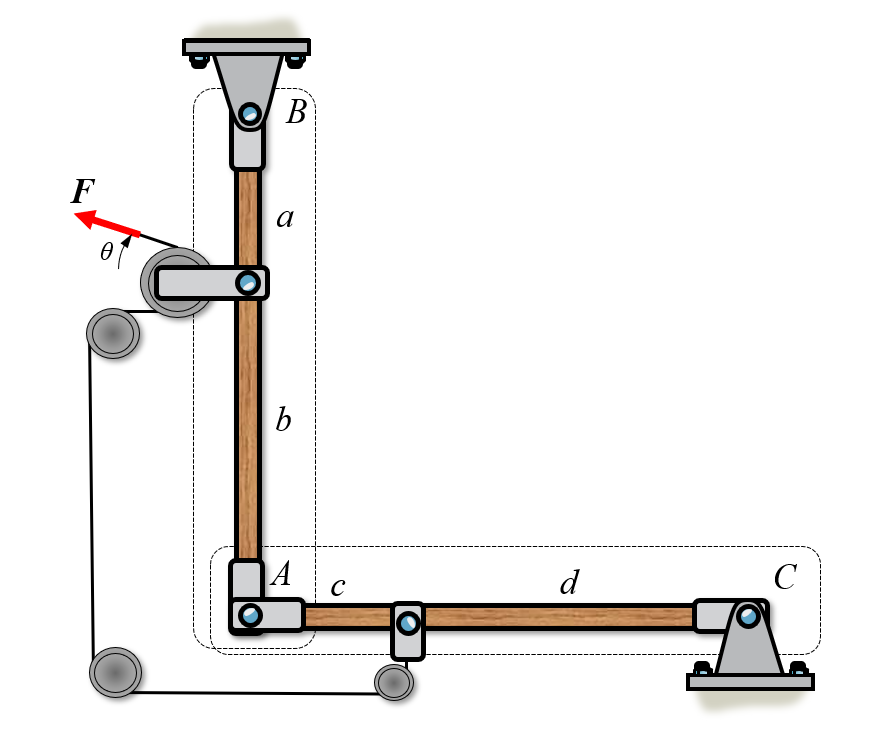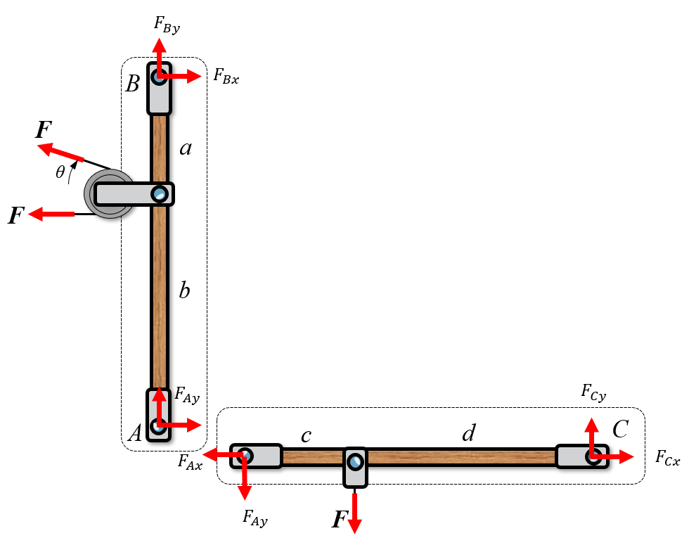 Here we have two systems, \(BA\) and \(AC\). Now we can create a free body diagram on each system separately. We assume that the rollers are frictionless such that the force \(F\) is translated without loss to body \(AC\).