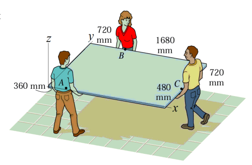 A rectangular board with mass \(m\) is carried horizontally by three people. Each person can only exert a force in the positive \(z\)-direction. We want to determine how much each person lifts.