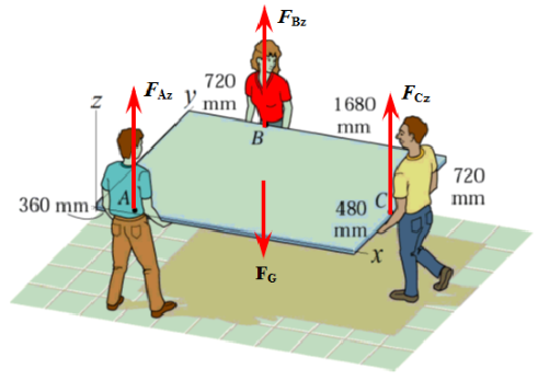 This is a three-dimensional problem. We place the origin at the lower-left corner and define position vectors for each person and for the center of gravity. Now both force and moment equilibrium are needed: three unknowns (\(F_{Az}\), \(F_{Bz}\), \(F_{Cz}\)) require three equations.