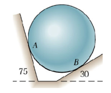 A sphere with mass \(m\) rests against two smooth surfaces as shown below. We want to determine the normal forces at \(A\) and \(B\).