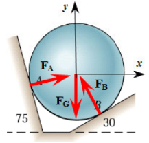 The contact surface at \(A\) has a normal direction at \(180° - 75° - 90° = 15°\) from the positive \(x\)-axis, and the surface at \(B\) has a normal at \(30° + 90° = 120°\). We define a unit direction vector \(\bm e(\theta) = [\cos\theta, \sin\theta, 0]^T\) and express each force as a magnitude times its direction.
