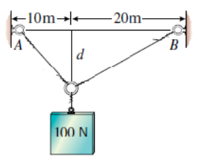 A 100 N weight hangs from a point \(R\) that is connected by wires to supports at \(A\) and \(B\). The distance \(d\) below the support line is a free parameter. We want to determine how the wire tensions vary with \(d\).