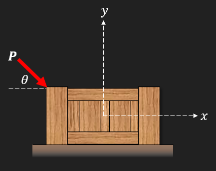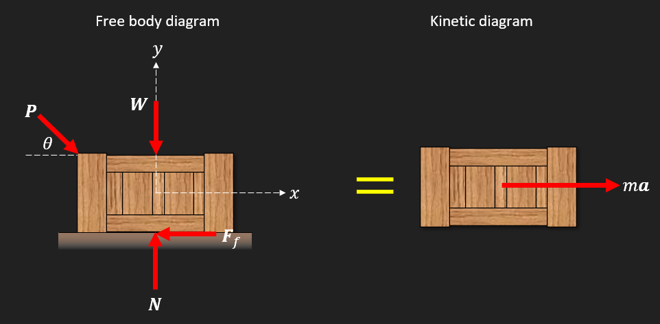 # Define symbolic variablesmu_k, m, g, v_0, P, theta, N, a_x, t = sp.symbols('mu_k m g v_0 P theta N a_x t')x = sp.Function('x')(t)# Define vectors for the forces and accelerationF_ext = P * sp.Matrix([sp.cos(theta), -sp.sin(theta)])F_N = sp.Matrix([0, N])F_W = sp.Matrix([0, -m*g])F_f = sp.Matrix([-mu_k*N, 0])a = sp.Matrix([a_x, 0])# Newton's second law: sum of forces = m*aekv = sp.Eq(F_ext + F_N + F_W + F_f, m*a)ekv